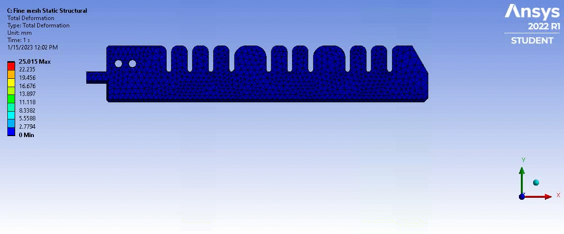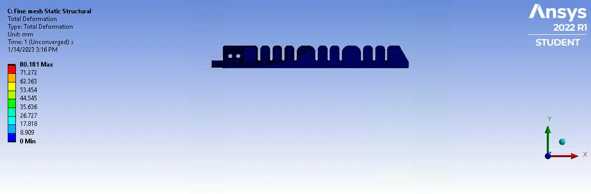 I developed a static structural FEA model to analyze and increase its bending angle. This model allowed me to simulate and evaluate the gripper's mechanical behavior under different loading conditions. I applied a 4-bar pressure at the interior of the actuator, replicating the pneumatic forces acting on the soft structure during operation. To ensure accurate results, I declared the flat face of the actuator as fixed support. Additionally, I incorporated a frictionless contact outside the inflation region to account for the interaction with external objects while maintaining realistic simulations. The FEA model served as an indispensable tool in understanding the gripper's stress distribution, deformation, and overall performance during its delicate operations, further validating its capabilities in handling fragile round objects with utmost precision and care.